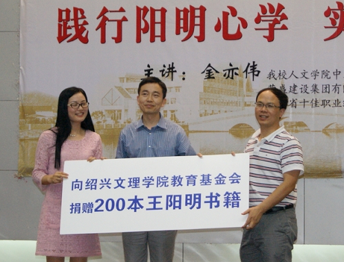 开讲前,金亦伟校友与绍兴市职教中心副校长张悦耳校友共同向我校教育基金会捐赠两百本王阳明书籍,校友联络办主任、教育基金会秘书长毛宇锋老师代表学校基金会接受捐赠。