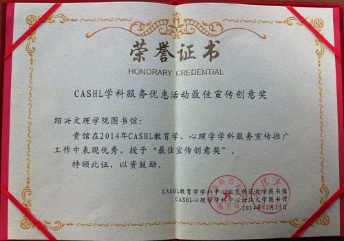 12月23日,我校图书馆与北京师范大学图书馆、浙江大学图书馆等5个高校图书馆并列获得“2014年CASHL教育学、心理学学科文献传递优惠活动”宣传创意奖。