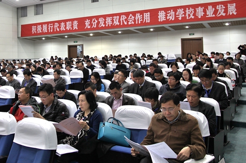 周达军书记号召每个文理人面对新形势、新要求、新任务,都要积极行动起来,努力奉献自己的才智。希望代表们不辜负全校师生职工的期望和重托,以高度的主人翁精神,充分利用好“双代会”这个平台,履行神圣职责,集思广益,共谋大计,为学校发展积聚正能量。