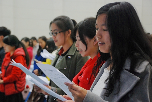 党课之前,学员们全体起立合唱了两首革命歌曲《团结就是力量》、《没有共产党就没有新中国》,气势豪迈的歌声一遍遍地在礼堂上空回响,立刻调动了党课气氛。