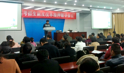 12月13日上午,浙江省高考招生制度改革精神辅导报告会在我校图书馆一楼报告厅举行。省教育考试院边新灿副院长做专题讲座,校党委副书记唐和祥主持会议。各二级学院院长、教学副院长、负责招生的学工副书记、专业主任及教务处、学工部等相关人员参加会议。