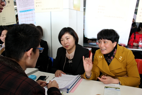 上午9点,会场内早已聚集了来自不同专业的应聘学生。部分学生手持与其专业相关的展位序列号直奔招聘单位所在点,还有部分学生则在旁咨询一些用人单位的招聘条件及发展方向。