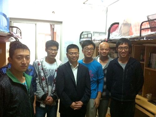 在117寝室门口时,寿副校长发现寝室里有很多运动器材,便微笑着问:“这么多运动器材,你们都爱什么体育运动呀?有没有参加今年的运动会?”校领导这种拉家常式的问话让现场的紧张气氛一下子缓解了。“今年运动会开幕式很有特色,节目丰富多彩,让人耳目一新;校内体育运动设施不够多,希望学校能多添置一些……”围绕体育运动这一主题,寿副校长和同学亲切交谈,他指出,体育锻炼不仅能提高大学生的身体素质,也能培养集体意识。他希望在大学里,大家不仅要认真学习,还要自觉参加体育锻炼。学校也会尽全力改善体育运动硬件设施,积极为大家创造更好的条件以带动更多的师生加入到体育锻炼中来。
