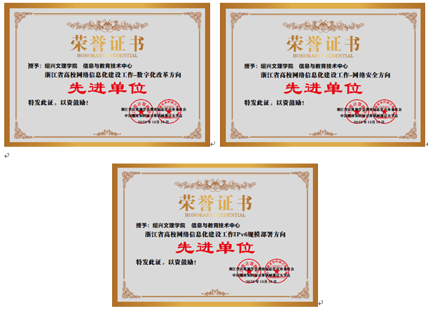 近日,2022年浙江省高校网络信息化建设相关奖项评选结果正式公布,我校荣获浙江高校网络信息化建设“数字化改革先进单位”“网络安全先进单位”“IPv6规模部署先进单位”三项集体荣誉,信息与教育技术中心任俊老师获评“浙江高校网络信息化建设先进个人”。