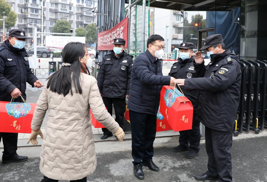 汪俊昌一行先后来到学校总值班室、河西配电房、河西校区南大门、南山校区大门、阳明书院、附属医院、兰亭校区、上虞分院、元培学院,亲切慰问了寒假期间依然坚守岗位的教职工,致以诚挚的问候并代表学校党委和行政送上了新春祝福和慰问品。