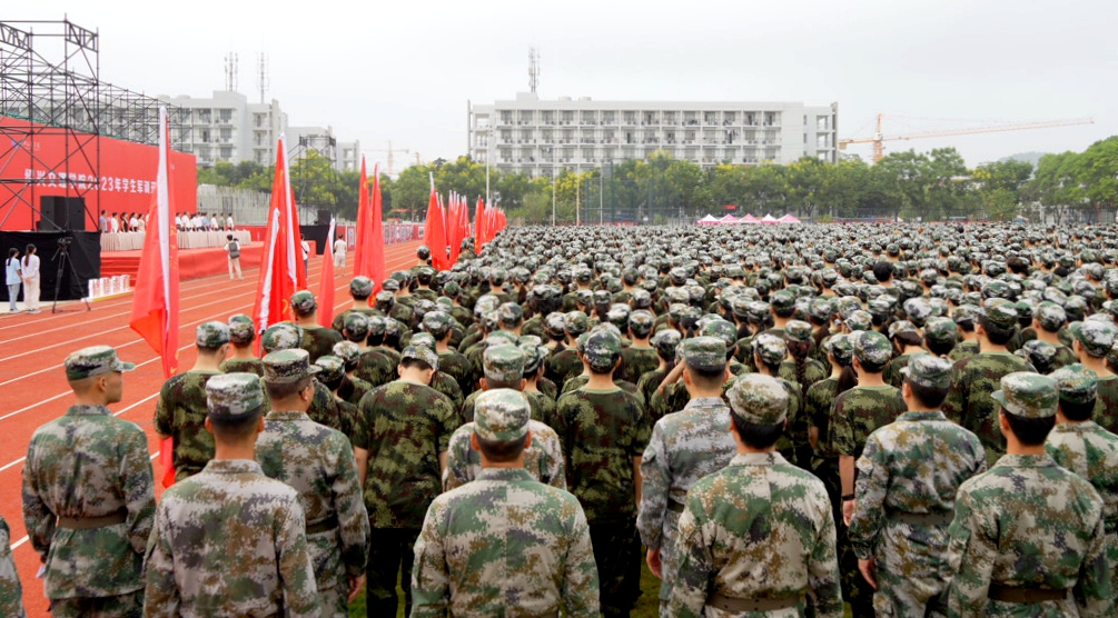 9月4日上午,我校在南山田径场举行2023年学生军训开营仪式。绍兴军分区大校司令员蒋明球,校党委书记汪俊昌,校长赵阳,越城区人武部上校部长罗劲松,校党委副书记张宏,副校长柳国庆,二级学院副书记,全体教官和连队指导员、参训学生参加开营式。