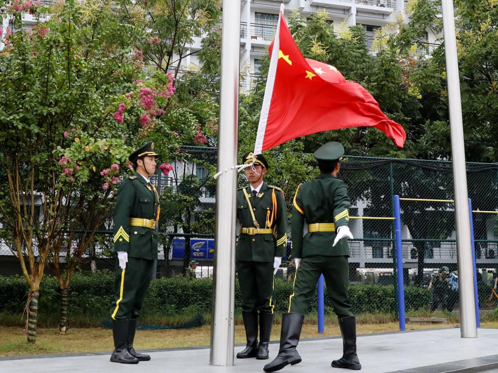 闭营式在庄严的升国旗仪式中拉开序幕,全体师生、教官面向国旗行注目礼。