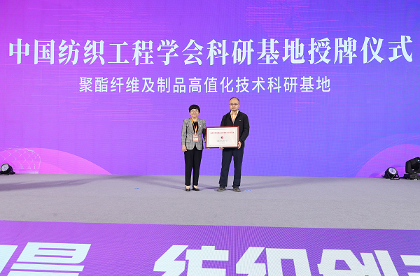 在论坛开幕式上,纺织服装学院的“聚酯纤维及制品高值化技术科研基地”还获批为中国纺织工程学会科研基地,高惠芳为基地进行了授牌,这是学会、高校、企业、产业合作的又一个具体行动,进一步夯实了纺织科技发展基础,提升了纺织科技协同创新力。