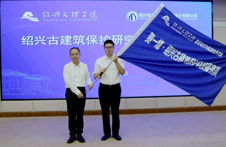 赵阳为研究院特邀专家颁发聘书,为“贺一烽·绍兴古建筑科技服务队”授旗。