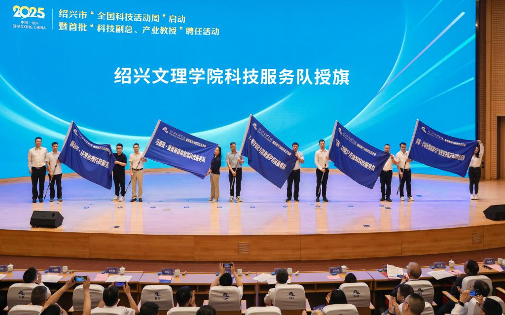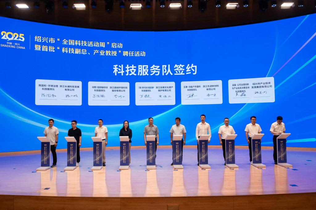 陈均土为5支科技服务队和合作企业授旗。生命与环境科学学院、化学化工学院、智能工程学院、纺织科学与工程学院、商学院(法学院)的陈国和·环境治理科技服务队、马德琨·氢能制备和利用科技服务队、万毅·数字活化与智能保护科技服务队、王建·功能户外面料科技服务队、吴磊·公司治理创新与产业投资决策咨询科技服务队分别与浙江水澜科技发展有限公司、浙江德创环保科技股份有限公司、浙江龙德文化遗产保护有限公司、浙江东进新材料有限公司、绍兴市产业投资发展集团有限公司达成合作。
