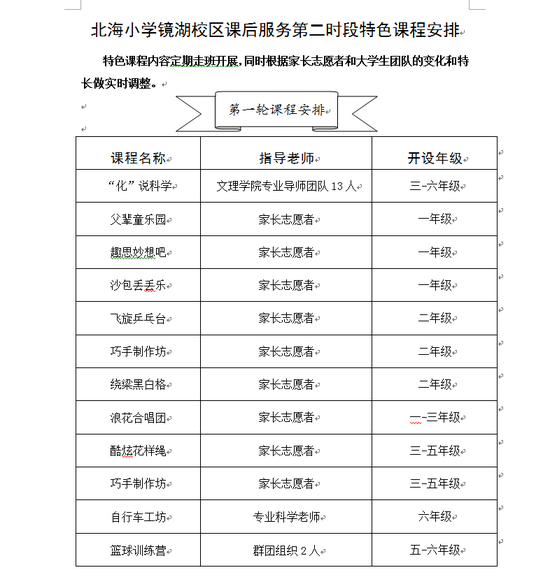 “基本服务+拓展服务”的课后服务模式收获成功后,北海小学教育集团镜湖校区并未停歇前进的脚步,努力求“新”,对课程新增特色元素;努力求“乐”,让学生乐享课后服务。根据越城区教体局“利用群团组织、高校资源、家长志愿者等丰富课程,提升课后服务品质”的精神,学校领导走进绍兴市文理学院化学化工学院,聘请了一批研究生和本科生作为课后服务拓展课程的教学志愿者。与此同时,学校还向广大家长发出邀请函,家长的参与性特别高。昨天,一支专业的大学生志愿者队伍和一支高学历、有特长的家长志愿者队伍成了镜湖校区的课后服务的导师团队。