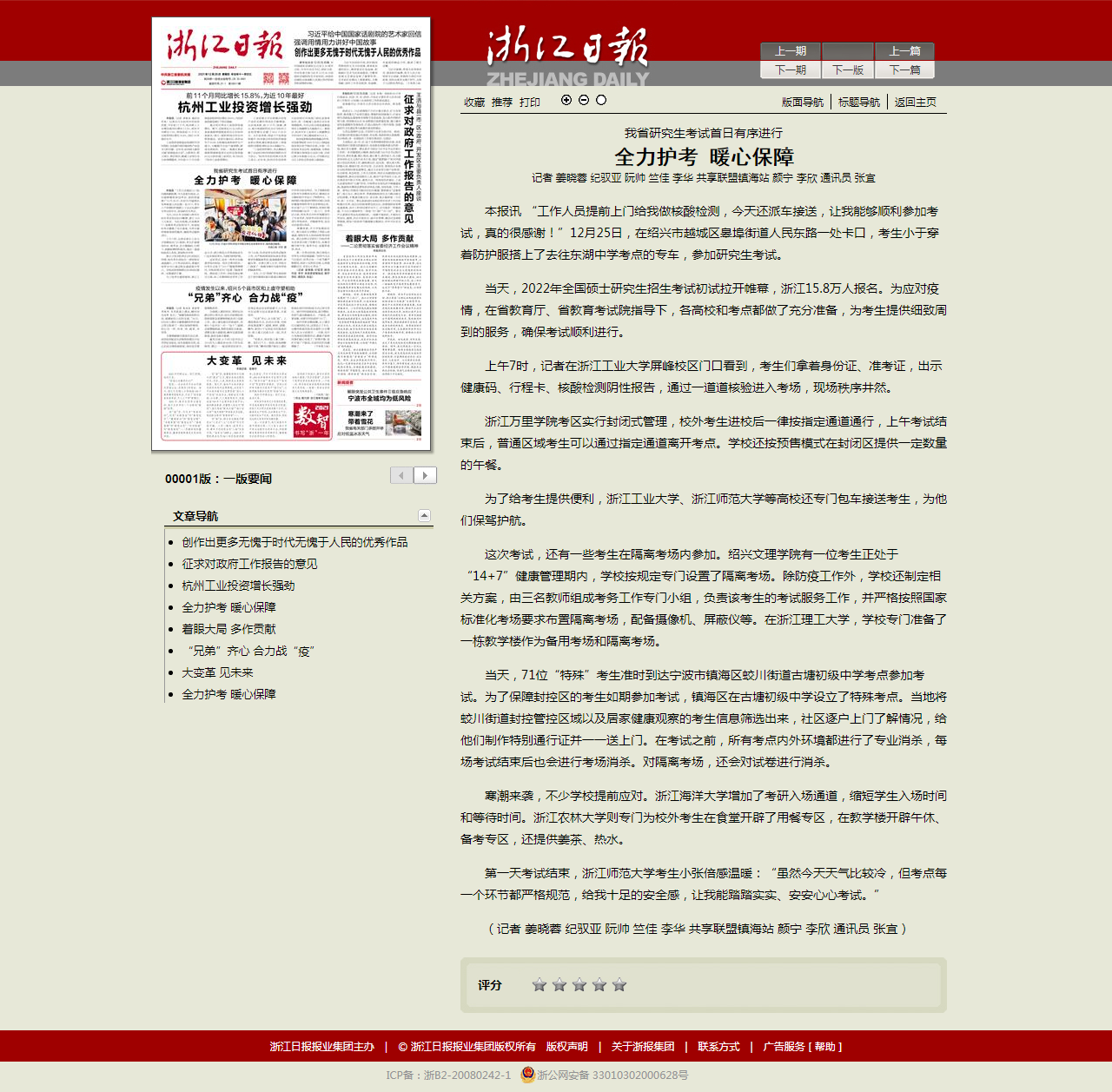 12月26日,浙江日报头版刊登《全力护航 暖心保障 我省研究生考试首日有序进行》,文中列举了我校对特殊考生的保障措施。浙江省人民政府官网、新华网、浙江新闻客户端、浙江在线等平台相继转发。