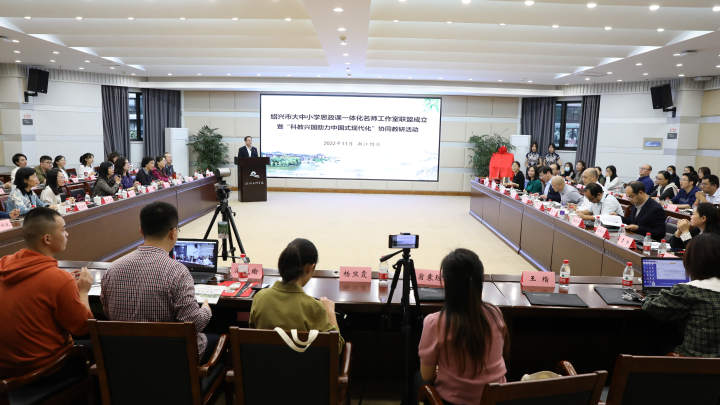 绍兴市大中小学思政课一体化名师工作室联盟成立仪式后,开展了“科教兴国助力中国式现代化”协同教研活动。7组来自不同学段的大中小学骨干教师共讲《习近平新时代中国特色社会主义思想学生读本》一门课,围绕这一重大的理论和实践问题开展“同课异构”。通过题目拟定的具象化到形象化再到抽象化,从故事、案例、议题、命题、理论的阶梯式的层层递进深入,将上好思政课大学阶段重在增强使命担当、高中阶段重在提升政治素养、初中阶段重在打牢思想基础、小学阶段重在启蒙道德情感等做了生动的课程展示。据悉,本次成立“绍兴市大中小学思政课一体化名师工作室联盟”是2020年绍兴启动全域推进大中小学思政课程一体化建设试点工作以来的又一项重点举措,旨在借由名师领衔,以资源共享为方式,以理论研究为载体,以课堂教学为重点,以专题培训为依托,以合作共赢为原则,通过多形式活动,为思政课教师搭建交流的舞台、成长的摇篮,实现“名师引领、团队合作、共同提高、资源共享、均衡互补”,使其成为教育发展的助推器、人才强区的集聚地,教育教学改革的新高地,从而深化大中小学思政课一体化建设市域模式的探索,成具有绍兴特色、高辨识度的大中小学思政课一体化建设的“绍兴范式”,成为浙江省乃至全国的大中小学思政课一体化建设的实践高地。