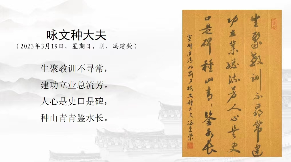 同时,文种也非常具有当代启示意义。冯建荣说,从文种身上可以看出,他顺天。顺从天命,顺应天命,依天命行事,是文种重要的处事理念。文种所讲的天,指天时、天意、天道,是大势、规律、法则,是机遇、机会、机缘。文种顺天思想的启迪是搞经济,即必须适应宏观经济形势,必须顺应经济规律,必须时刻关注商机,必须全力抢占商机。