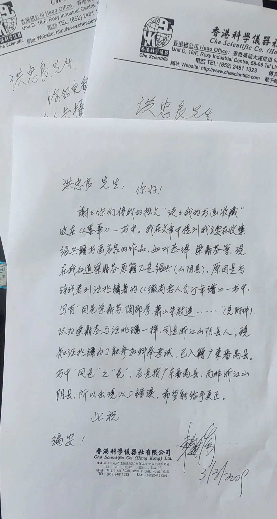 “我曾在1990年代业余学过中国画和书法,后来兴趣转向于收藏字画和书籍了。在这十年,对于收藏的兴趣是越来越浓厚了,可以说把我的周末和假期的时间都花在拍卖行(中小型)和旧书画店及旧货市场地摊上了。就是不在香港,我也是往市场、地摊上去淘。当有收获时真是非常之高兴,如有好的艺术品时,真能享受到无穷的乐趣。至于收集书画作品方面,我把重心放在收集绍兴籍(含当时作者出生时属绍兴的萧山和余姚)的书画家。而我发现了我们绍兴籍老乡在广州(番禺)真的很多,而且是赫赫有名,使我很惊奇和骄傲,因为他们高雅的艺术,在广东和香港这么有崇高的地位,许多更是国学名宿。我手上现有的名家有:叶恭绰,是解放后任北京画院院长和中央文史馆副馆长;梁鼎芬,曾是光绪皇帝的老师;汪兆铨,曾任广东教育厅长;汪兆镛,是进士和书法家、诗词家;吴道镕,是进士和书画家;沈仲强,是名花卉画家;朱启连是书法家(朱执信的父亲)等。这些名家的父亲或祖父辈,大部分是绍兴籍的在广东做小官或师爷而落籍在番禺。还有出生在北京的有吴镜汀、吴光宇、俞致贞、朱家溍、陈东湖和天津出生的王叔晖。以上三地名家,他们的部分作品,我在2008年11月19日已赠送给绍兴县越国文化博物馆了。