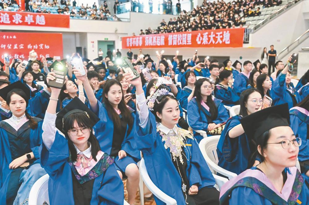 在6月16日的毕业音乐会上,浙江越秀外国语学院应用外语学院2024届毕业生陈彬现场表演了一首说唱歌曲《越秀越chill》,赢得台下师生的热烈掌声。“这首歌是我6月初即兴创作、自编自唱的,希望它能为我们的青春留下最后的回忆。愿我们在未来的道路上,依旧怀揣梦想、勇往直前。”陈彬告诉记者。(记者 胡安娜)