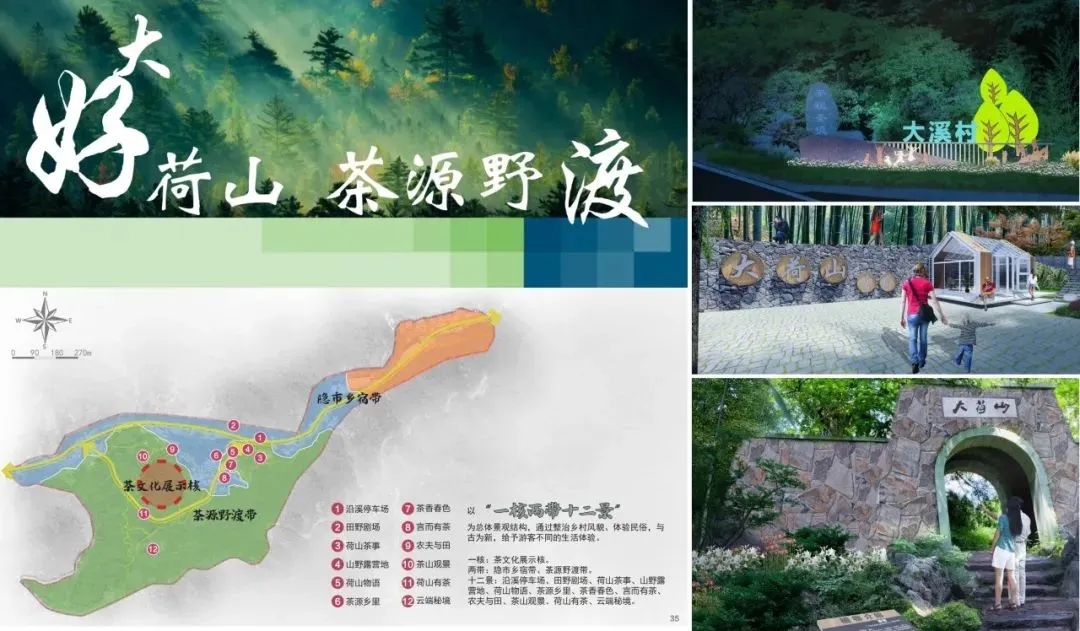 空间重塑,拓宽乡村发展“共富路”。风景园林学科教工党支部先后组织师生150余人次,深入现场实地调研,梳理形成资源清单、需求清单、任务清单,编制完成《安吉大溪村大荷山乡宿共富村规划设计》,规划了“一核两带十二景”的乡村规划图。提升乡村风貌,在创建核心区大荷山区块高效完成了收储老宅、拆违改建、古道修复,通过村庄节点打造、道路系统完善、配套设施更新等项目开展,完成了道路环境提升,新增停车位30个,增设路灯40个,带动投资365万元。因地制宜改造提升村庄入口、田野剧场、乡村绿道等,建设共享茶园50亩,修复古道10公里,形成便行、可游、宜居的文化共享空间。