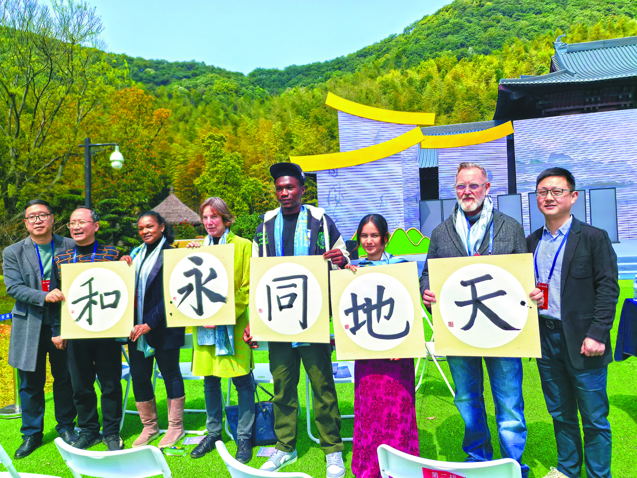 开幕式上,书法名家和五名来自五大洲的外籍书法爱好者,共同为本届书法节开笔。外籍书法爱好者写下了“天地同永和”五个大字,交流书艺,以艺传情。