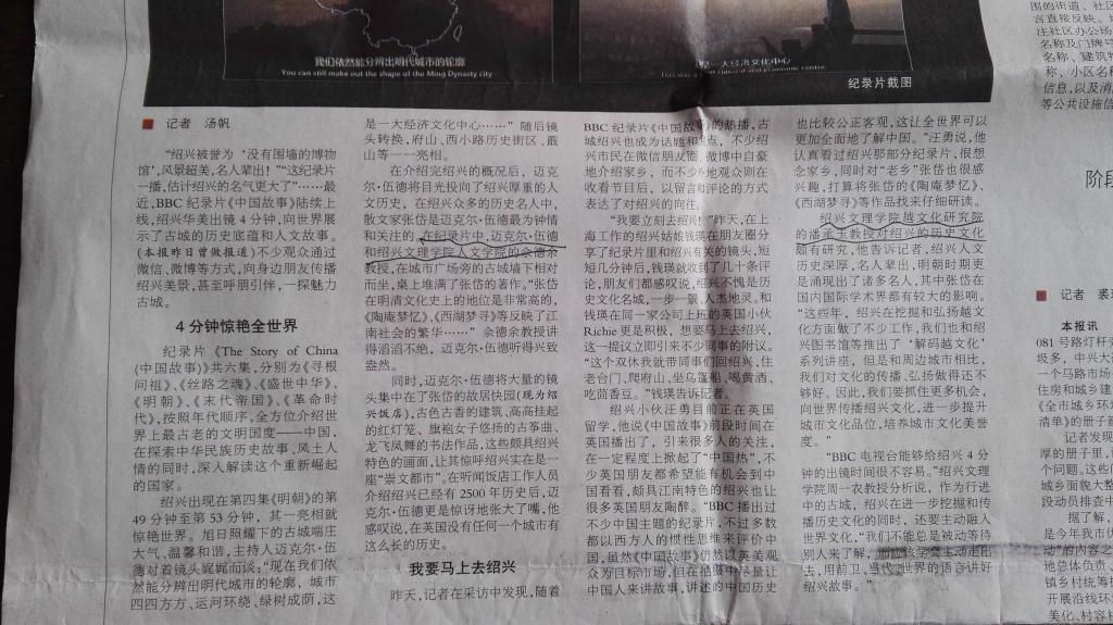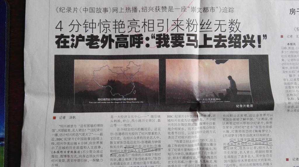 《绍兴日报》:纪录片<中国故事>网上热播,绍兴获赞是一座“崇文都市”追踪