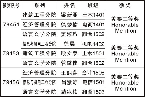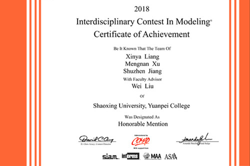 在学院和领导的关心支持下,元培学院公共基础分院数学教研部组建了由刘伟老师牵头,辛晓东、章月红、蒋望东等8名教师组成参与的多学科交叉指导教师队伍。数学教研部从去年3月份开始进行竞赛学生选拔、组织、宣传和培训指导等各项工作。通过周末、暑假培训、专家讲座、实战演练等方式,最终确认由来自经济管理分院、建筑工程分院、信息与机电工程分院、语言文学分院组成的3支队伍共9名学生参赛。2月11日至14日,3支参赛队伍通过4天4夜的查阅外文资料、建立模型、求解模型、解释模型结果,完成每组20多页英文论文的撰写,并获得国际奖项,为申请国外学校和研究生复试助力。