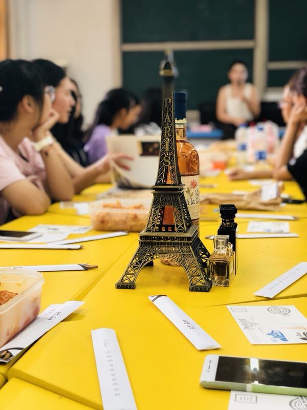 意法风情馆悬挂着意法两国的国旗,埃菲尔铁塔的海报背景、香奈儿香水和法国香槟营造的氛围,令人仿佛置身于欧洲。同学们一边和意大利外教学唱意大利歌曲,一边和外教老师们分享意大利面、法棍和可颂等传统食品。