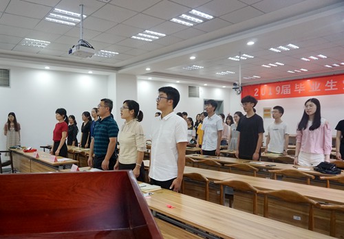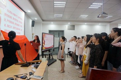 全体党员奏唱国歌。学院党总支向每位党员赠送一枚党徽,并由党支部书记为各支部党员一一佩戴,提醒青年党员们将来无论走到哪里,无论从事何种职业,都要始终牢记自己是一名中国共产党党员。毕业生党员代表管锭婷带领大家重温入党誓词,全体党员面向党旗,举起右手,紧握拳头,庄严宣誓,展示他们无比激动的内心。