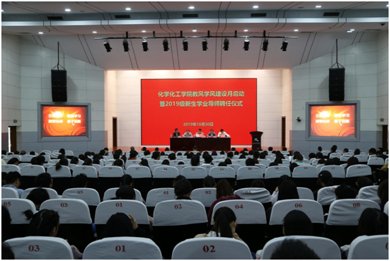10月30日下午,我校化学化工学院教风学风建设月启动暨2019级新生学业导师聘任仪式在铁城科技馆举行。化学化工学院党政领导班子,各系、专业主任、班主任、新生学业导师以及2019级全体新生、全体党员学生及其他年级学生代表共300余人参加了会议。