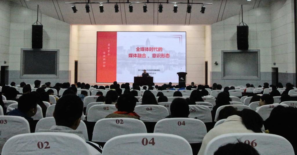 12月12日晚,绍兴市委宣传部副部长、市政府新闻办主任韩彬翔做客“时政大课堂”,作题为《全媒体时代的媒体融合、意识形态》的讲座。部分二级学院学生科长、辅导员、化学化工学院2019级新生、机械与电气工程学院2019级新生400余人聆听了讲座。
