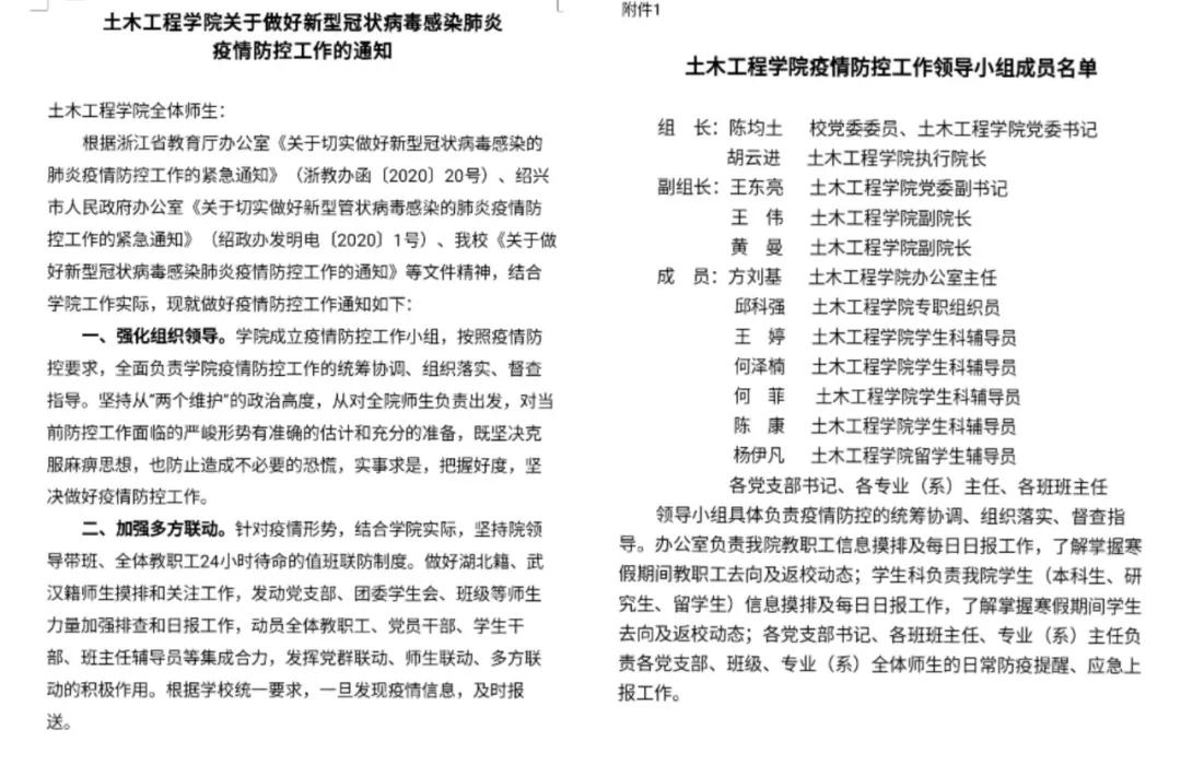 当下,全国新型冠状病毒感染肺炎疫情态势严峻。党中央高度重视,习近平总书记发出“生命高于一切,疫情就是命令,防控就是责任”的有力号召。土木工程学院第一时间成立了疫情防控工作领导小组,统筹协调疫情防控工作,积极响应绍兴市委组织部发出《关于充分发挥全市党组织和广大党员干部在新型冠状病毒感染肺炎疫情防控中的战斗堡垒作用和先锋模范作用的通知》要求,动员全院师生、党员干部迅速行动,为抗击疫情、支援武汉贡献力量。