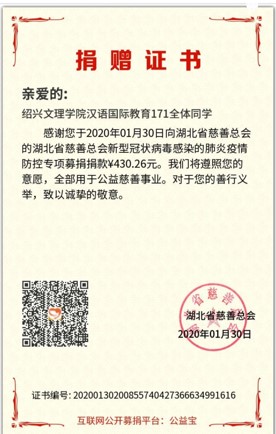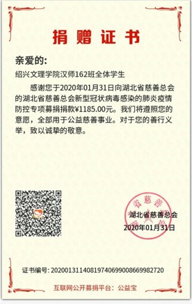 1月30日,学院党委通过网络发起募捐倡议,各党支部和班团支部踊跃捐款,发起倡议1天时间后,向湖北省慈善总会的新冠状病毒防控专项项目捐款16039.94元,捐款还在持续进行中。
