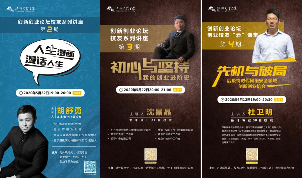 4个小时,452人累计观看,15194个点赞!近日,由校对外联络处、校友总会、党委学生工作部(处)、创业学院办公室共同主办的创业校友“云”课堂第二期、第三期、第四期圆满完成。艺术设计05届校友胡舒勇、艺术设计07届校友沈晶晶、会计学00届校友杜卫明以扎实的创业知识、丰富的创业经历、深刻的创业感悟激励感染着“云”课堂的每一位观众。
