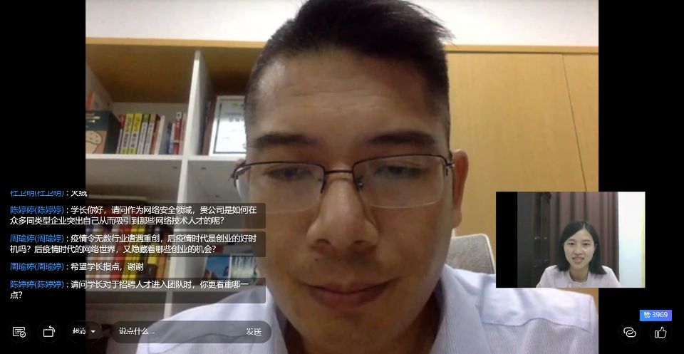 提问互动环节,在线观看直播的同学们踊跃发言、积极提问,三位校友认真聆听、耐心解答。