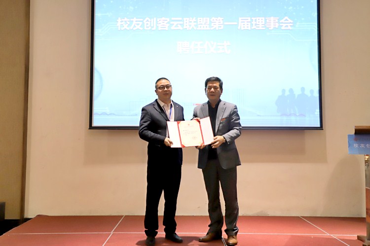 学院党委书记叶访春(图右)为云联盟第一届理事会会长潘自成(图左)颁发聘书