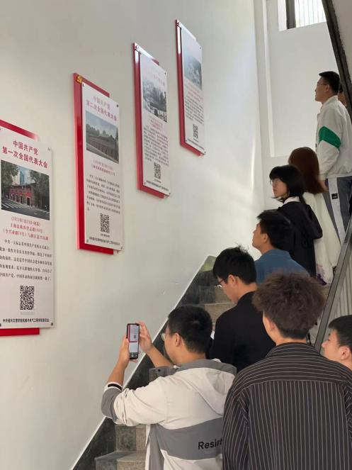 “党史楼道”通过19块展板图文并茂展示了中国共产党从“一大”到党的十九大的辉煌历程。从理工楼一楼至四楼,顺着历史足迹,楼道墙面上清晰呈现生动的党史展览,全景描绘了我党从艰难探索到开拓创新的奋斗历程。师生还可以通过手机扫描展板上的二维码了解历次党代会的详细信息。