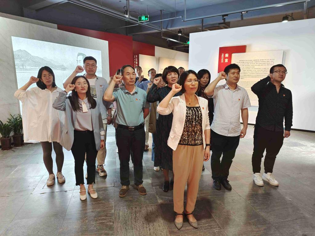 最后,全体党员在周恩来纪念馆主馆前,在鲜红的党旗下举手宣誓,重温入党誓词。