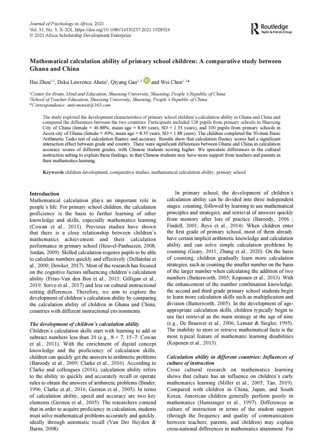 近期,由教师教育学院教师周珲和陈巍共同指导的心理健康教育方向国际硕士留学生雨果(Deku Lawrence Aheto)的论文Mathematical calculation ability of primary school children: A comparative study between Ghana and China发表于SSCI来源期刊《非洲心理学期刊》(Journal of Psychology in Africa),2021年第31卷3期。