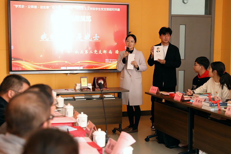 会上举行了机关第二党支部与马院学生党支部“三联系”结对仪式,机关第二党支部党员干部向结对学生赠书。