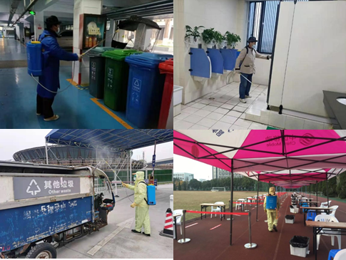 加强校园环境消杀,确保公共场所重点区域无防疫死角。新宇物业环境管理部立即开展防疫物资的自查,确保口罩、消毒液、防护服、测温枪等物资充足,同时召开部门会议,对环境整治、重点部位和全校范围内的消杀进行落实布置。保洁人员定期开展全校范围内的消杀,重点对于餐厅周边、公寓周边、电梯轿厢、各类场馆和会议室、卫生间进行无死角的喷洒消毒液。室内保洁员对于教室门把手、讲台、课桌椅、电梯按钮、楼梯扶手等进行仔细擦拭。
