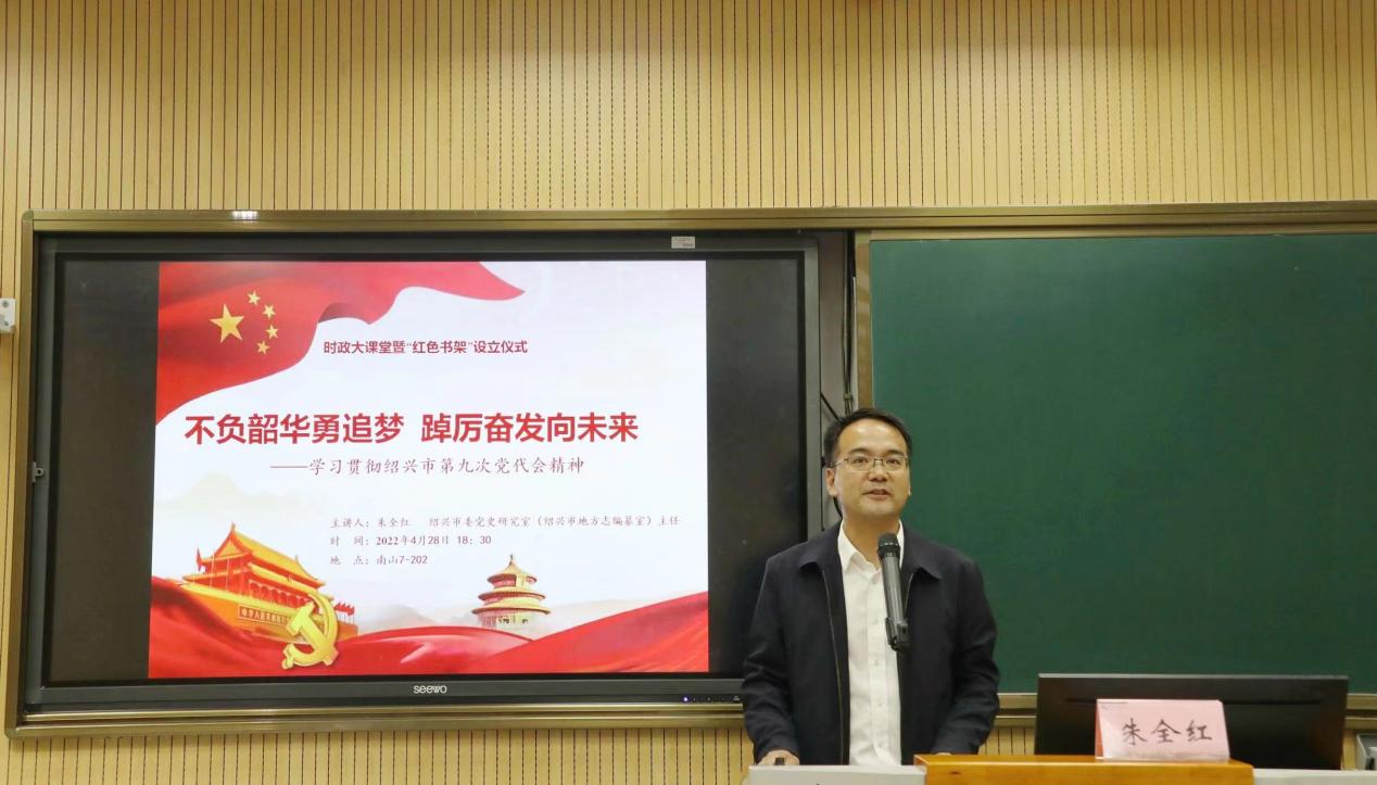 为充分发挥好“时政大课堂”对学院思想政治工作的有效促进作用,4月28日晚,教师教育学院在南山校区7号楼202室举行时政大课堂暨“红色书架”设立仪式。活动专门邀请了绍兴市委党史研究室(绍兴市地方志编纂室)主任、绍兴市第九次党代会代表朱全红为学院师生做以“不负韶华勇追梦,踔厉奋发向未来”为主题的绍兴市第九次党代会精神宣讲。