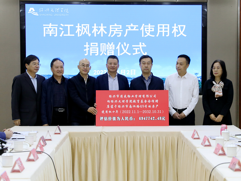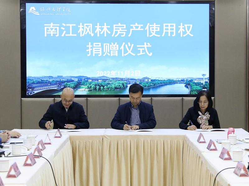 11月2日上午,“南江枫林房产使用权”捐赠仪式在铁城科教馆一楼会议室举行,校党委副书记沈赤,绍兴市清爽物业管理有限公司总经理许国利、副总经理柳伟英,城南街道书记倪国锋及相关工作人员,学校相关职能部门负责人、生命科学学院领导班子成员和教师代表参加捐赠仪式。