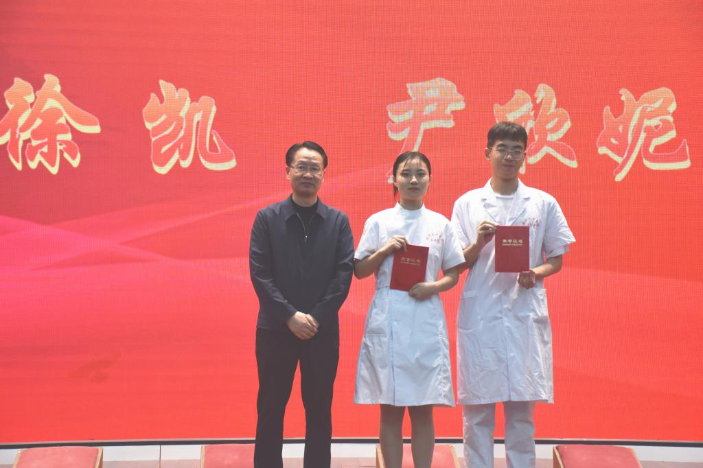 郭航远为第十七届护理知识竞赛一等奖获得者颁发获奖证书;宣海江、医学院党委书记吴剑平为二等奖获得者颁发获奖证书。医学院党委副书记林国旗宣读获奖学生名单。