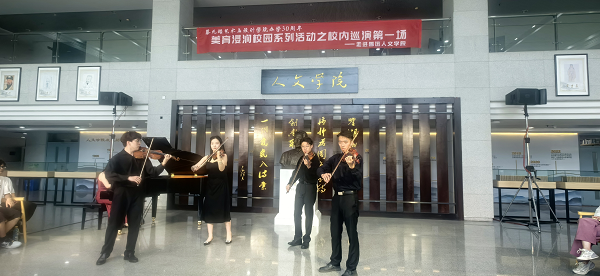 为活跃校园文化氛围,深化校园美育教育,促进不同学院之间的文化交流与融合,5月15日下午,蔡元培艺术与设计学院办学三十周年系列活动“美育浸润校园巡演第一场——走进南山”在鲁迅人文学院顺利举办,本次活动由蔡元培艺术与设计学院和鲁迅人文学院联合主办。副校长赵浪平,宣传部、蔡元培艺术与设计学院、鲁迅人文学院主要负责人参加活动,活动吸引了100余位师生到场欣赏。