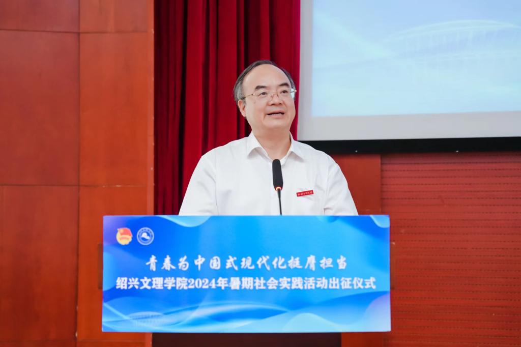 宋浩成向今年暑期社会实践习近平新时代中国特色社会主义思想实践、爱国主义教育、中华文化传承、乡村振兴、基层服务、民族团结、共同富裕、“千万工程”、“美丽浙江”、“浙里青廉”、就业创业、校地联合团建、西部计划等13个主题实践的校级重点团队学生代表授旗。