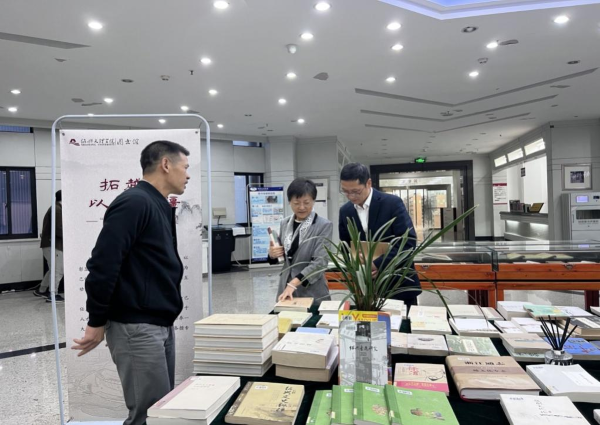 唐晓青一行还参观了在图书馆二楼大厅举行的“拓越学以至无疆——‘越文化’主题书展”。