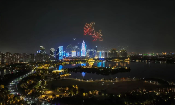 在志愿者协助下,一千架无人机在空中编织出醒目的“绍兴”二字。