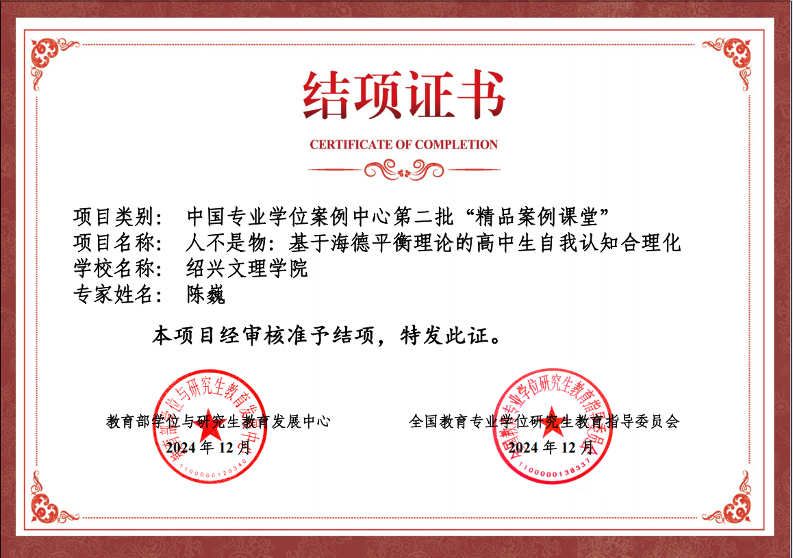 近日,教师教育学院院长陈巍教授承担的教育部学位与研究生教育发展中心第二批“精品案例课堂”项目顺利结项。项目成果《人不是物:基于海德平衡理论的高中生自我认知合理化》将被收录至中国专业学位案例中心案例库。