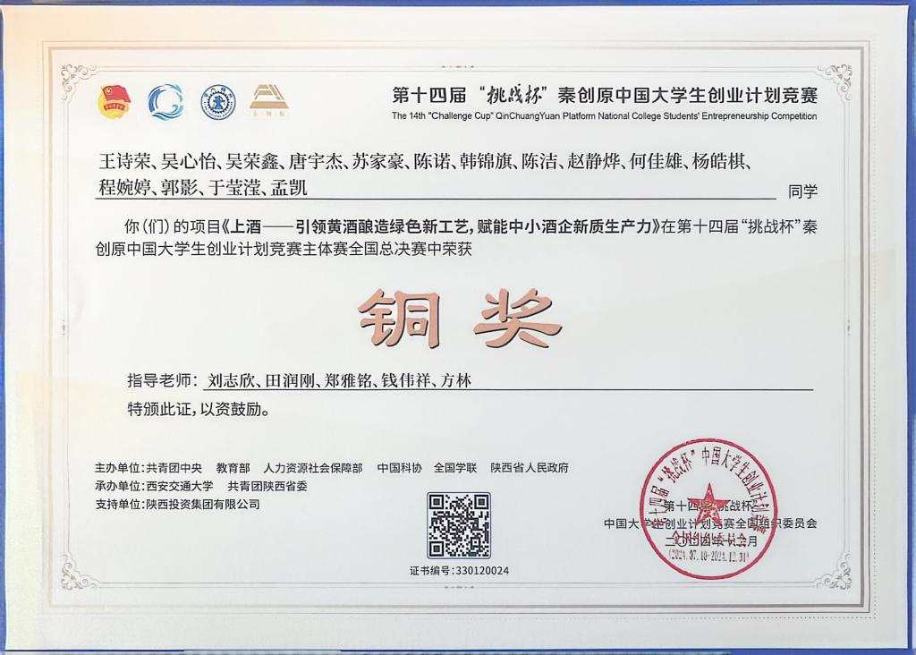 日前,由共青团中央、教育部等部门联合主办,西安交通大学、共青团陕西省委承办的第十四届“挑战杯”中国大学生创业计划竞赛全国总决赛在西安交通大学举行。经评审,我校生命与环境科学学院大学生创业计划项目《上酒——引领黄酒酿造绿色新工艺,赋能中小酒企新质生产力》获国赛(主体赛)铜奖,实现了学校在 “挑战杯”大学生创业计划竞赛国赛奖项零的突破。