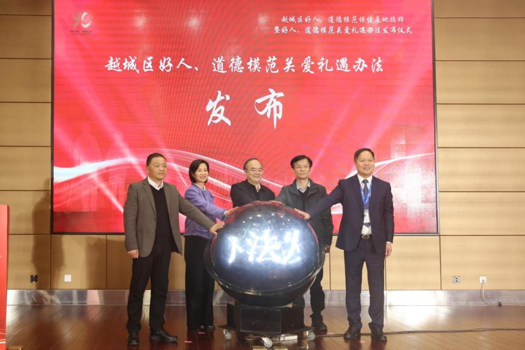 与会领导共同按下启动装置,标志着越城区好人、道德模范关爱礼遇工程全面落地。