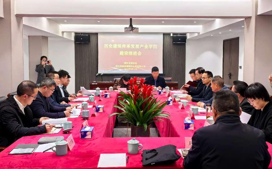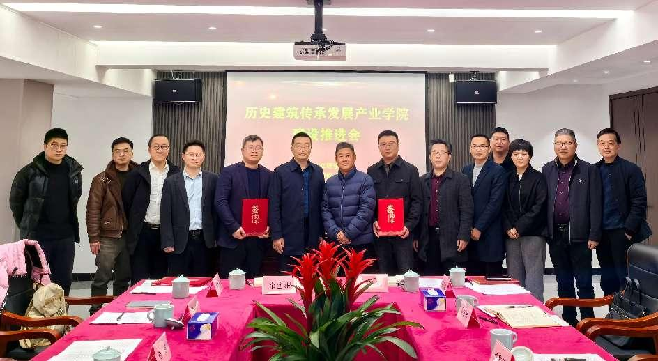 袁油迪与边高焕代表校企双方签订战略合作协议;黄睿与边高焕签订校外实习基地协议。参会人员还就历史建筑传承发展产业学院建设开展了深入研讨,达成初步共识。