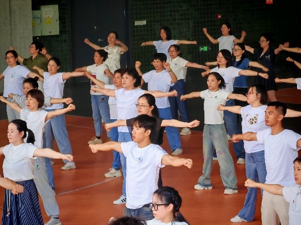 活动特邀专业健身教练俞祝琴进行现场教学,俞教练是国家体育总局体操运动管理中心排舞导师级教练、国家级裁判、国家级社会体育指导员。教练从基础动作入手,耐心细致地分解每一个姿势要领。伴随着充满活力的音乐节奏,师生们认真学习,从生疏到熟练,最终完成了整套工间操的连贯展示。现场气氛热烈,整齐划一的动作成为操场上一道亮丽的风景线。